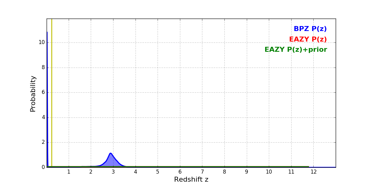 In P(z) plots: Yellow lines mark the cluster redshift z = 0.228,