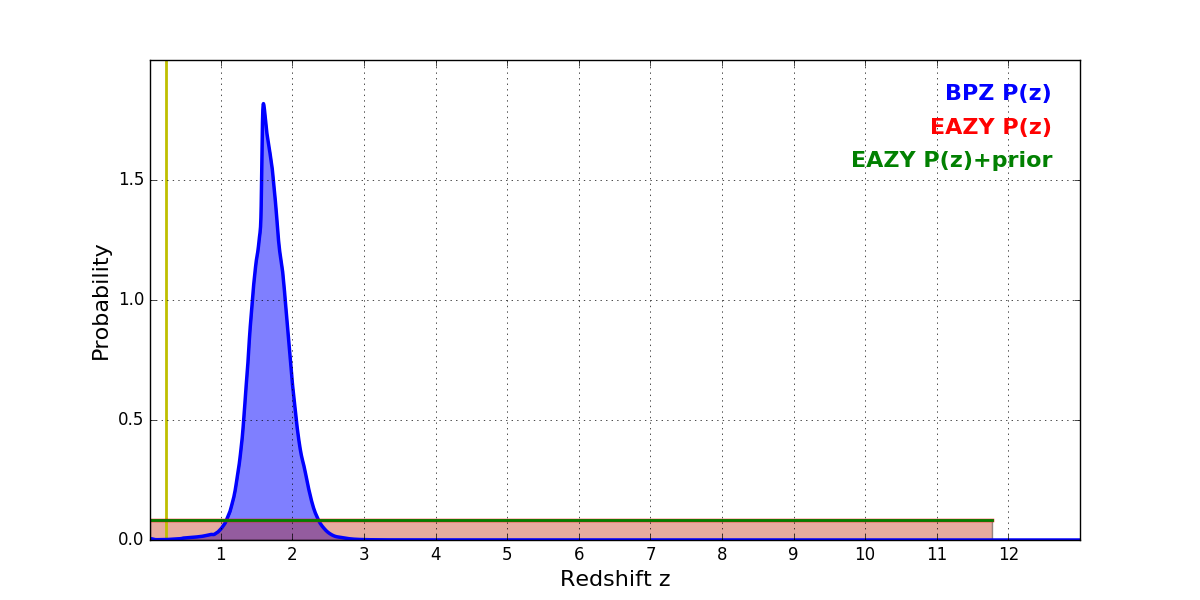 In P(z) plots: Yellow lines mark the cluster redshift z = 0.228,