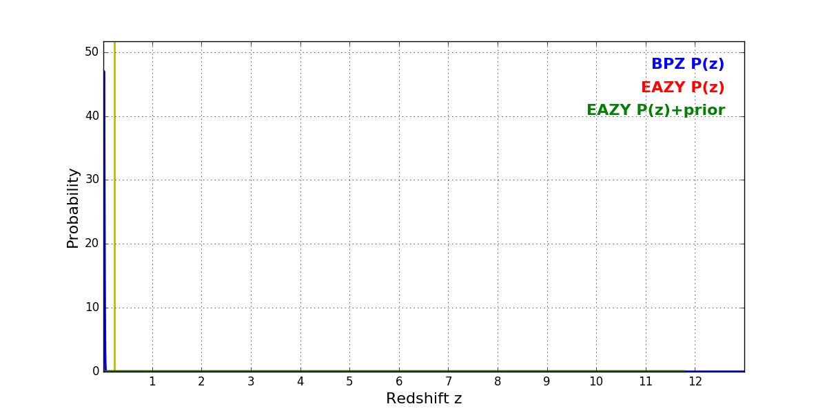 In P(z) plots: Yellow lines mark the cluster redshift z = 0.228,