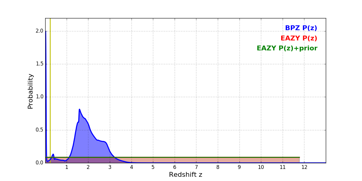 In P(z) plots: Yellow lines mark the cluster redshift z = 0.228,