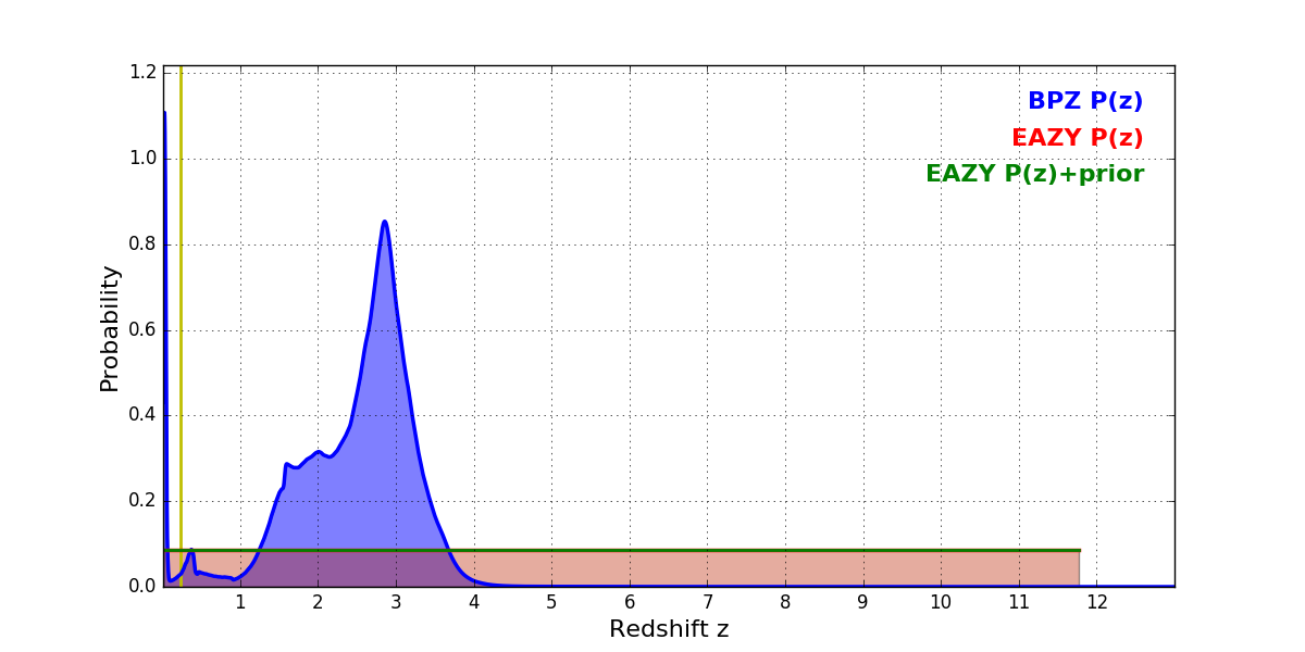 In P(z) plots: Yellow lines mark the cluster redshift z = 0.228,