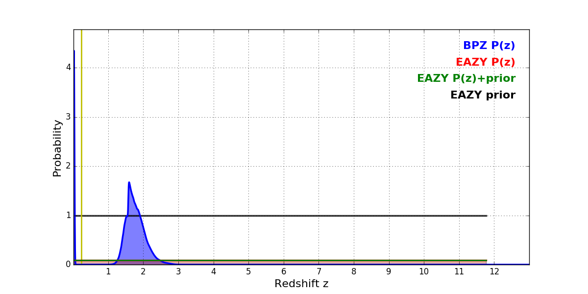In P(z) plots: Yellow lines mark the cluster redshift z = 0.228,