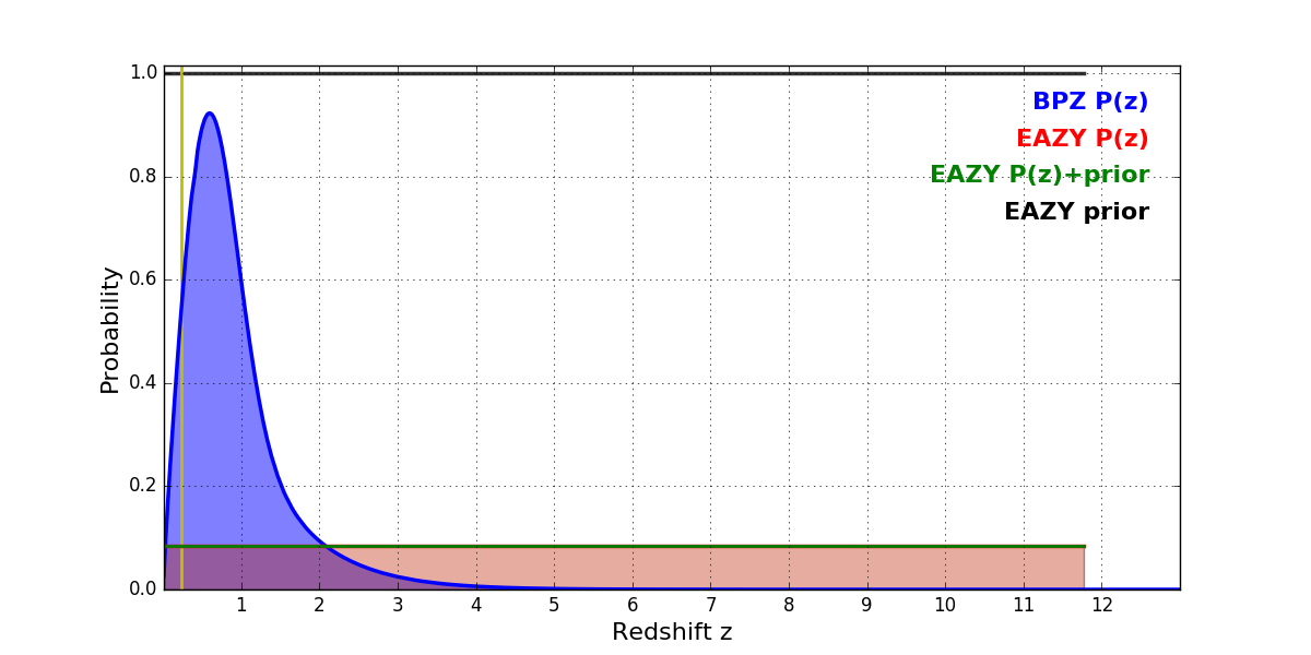 In P(z) plots: Yellow lines mark the cluster redshift z = 0.228,
