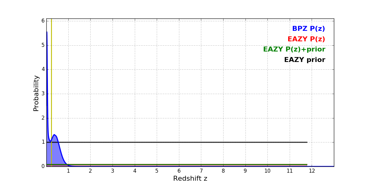 In P(z) plots: Yellow lines mark the cluster redshift z = 0.228,
