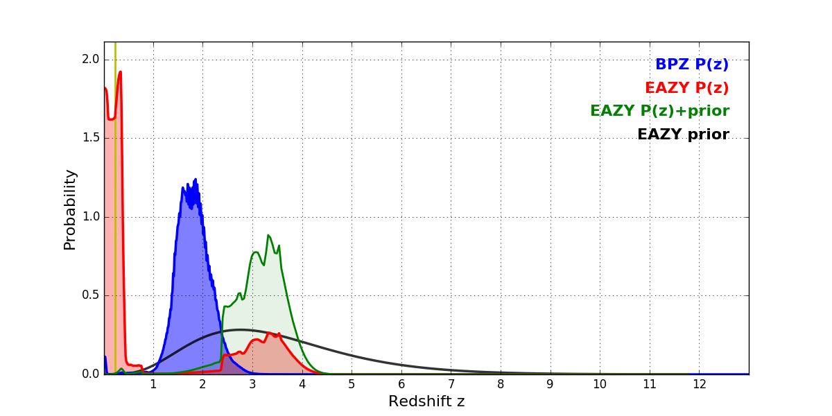 In P(z) plots: Yellow lines mark the cluster redshift z = 0.228,