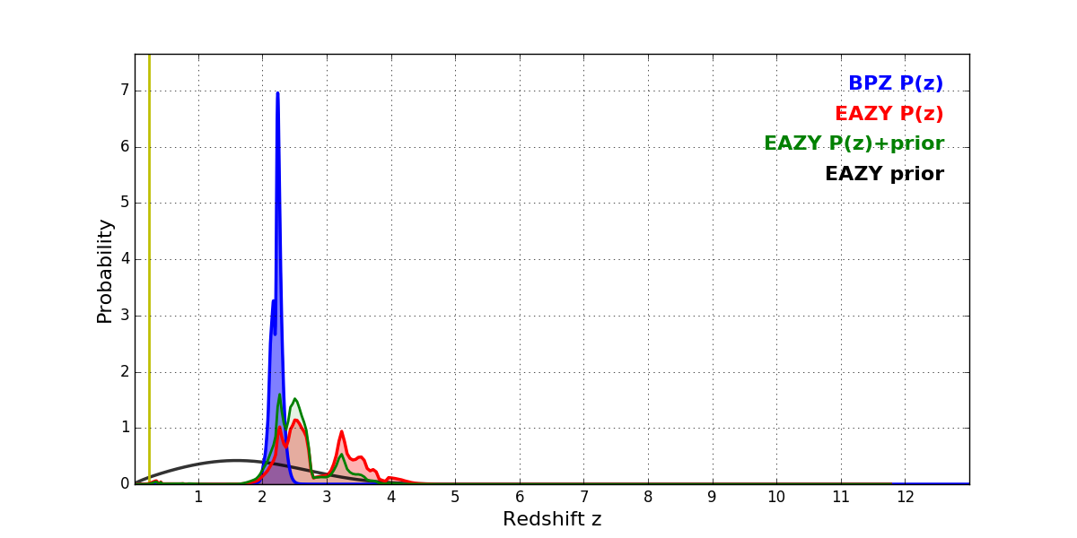 In P(z) plots: Yellow lines mark the cluster redshift z = 0.228,