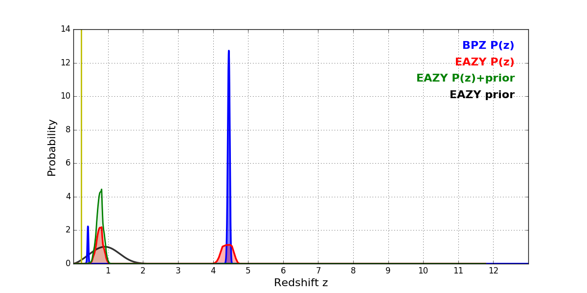 In P(z) plots: Yellow lines mark the cluster redshift z = 0.228,