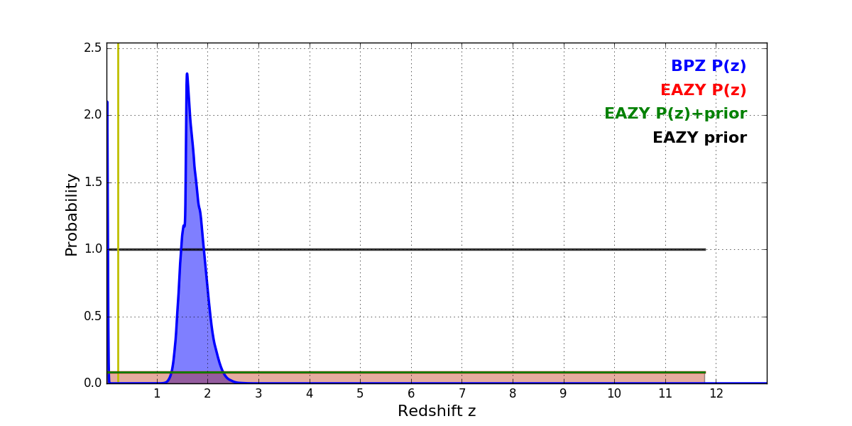 In P(z) plots: Yellow lines mark the cluster redshift z = 0.228,