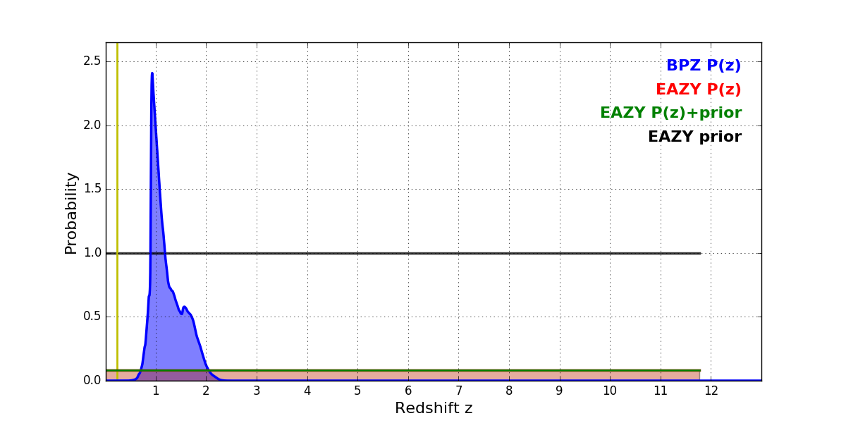 In P(z) plots: Yellow lines mark the cluster redshift z = 0.228,