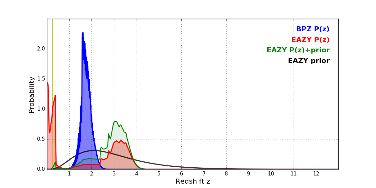 In P(z) plots: Yellow lines mark the cluster redshift z = 0.228,
