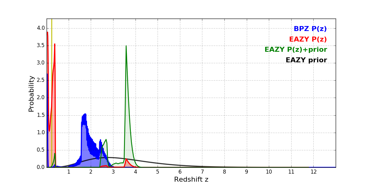 In P(z) plots: Yellow lines mark the cluster redshift z = 0.228,