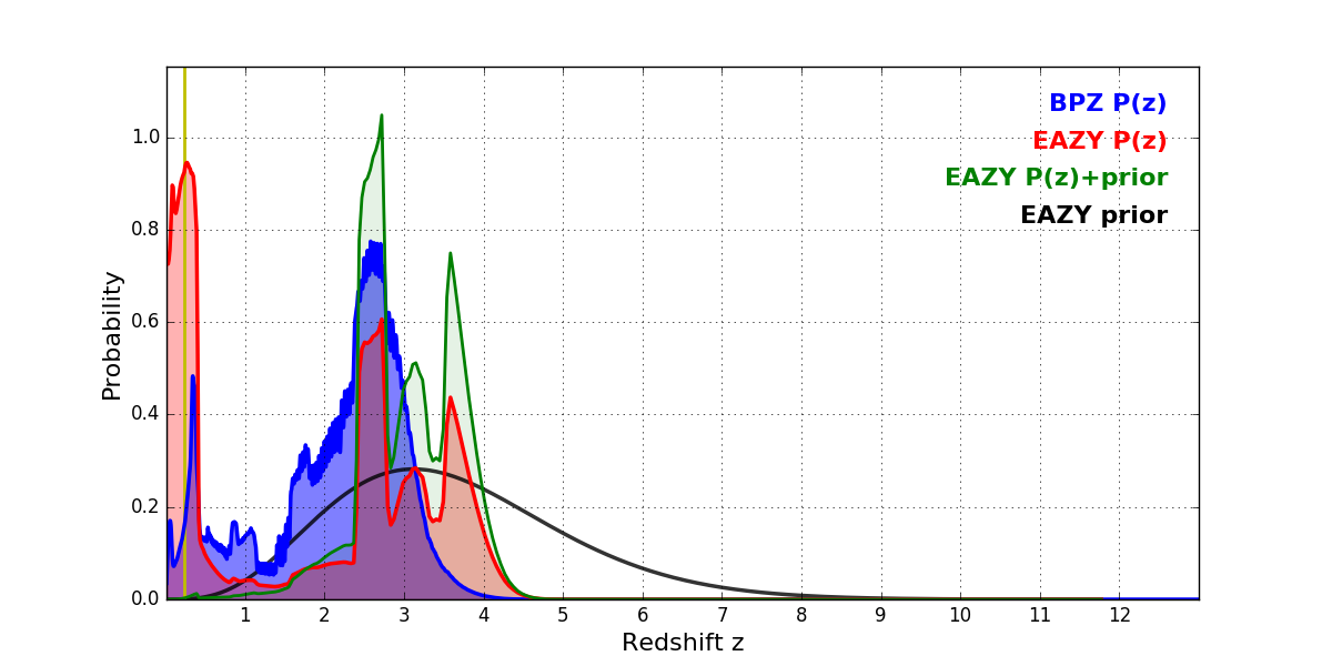 In P(z) plots: Yellow lines mark the cluster redshift z = 0.228,