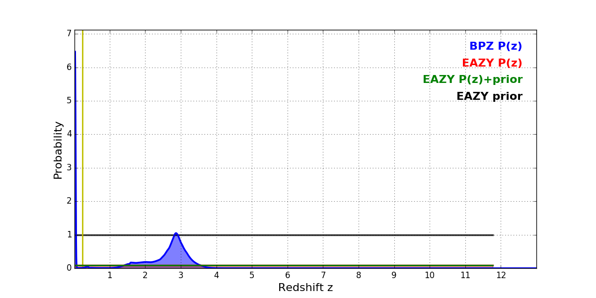 In P(z) plots: Yellow lines mark the cluster redshift z = 0.228,
