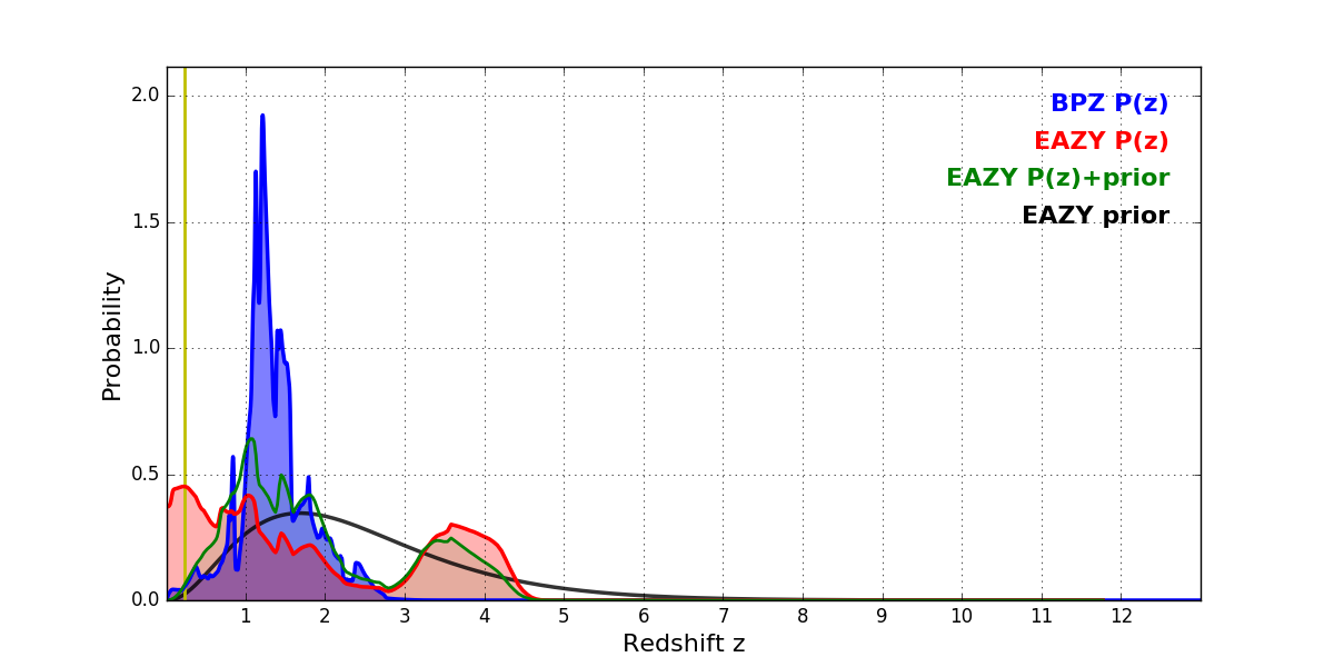 In P(z) plots: Yellow lines mark the cluster redshift z = 0.228,