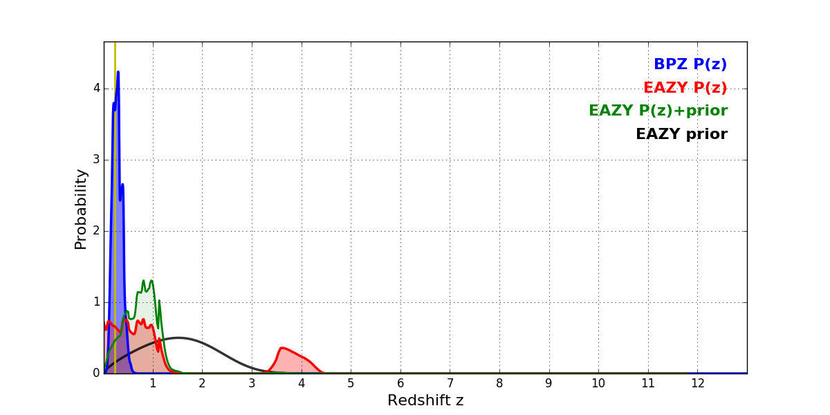In P(z) plots: Yellow lines mark the cluster redshift z = 0.228,