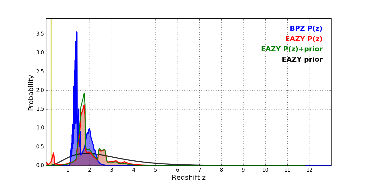 In P(z) plots: Yellow lines mark the cluster redshift z = 0.228,
