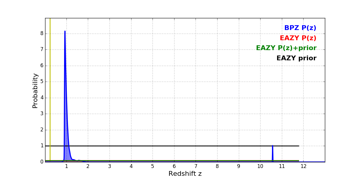 In P(z) plots: Yellow lines mark the cluster redshift z = 0.228,