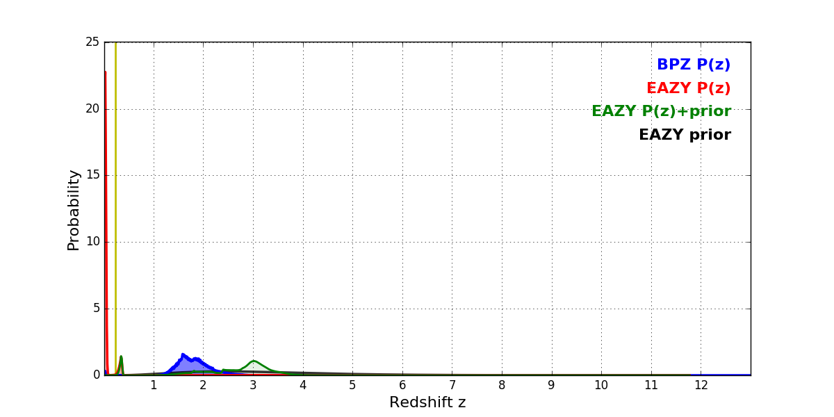 In P(z) plots: Yellow lines mark the cluster redshift z = 0.228,