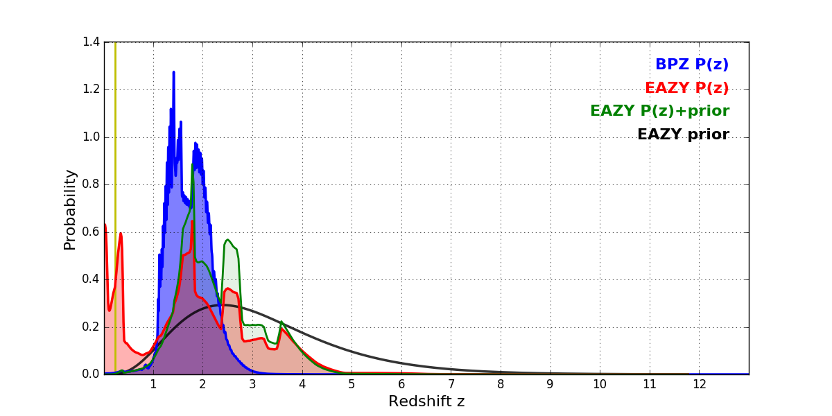 In P(z) plots: Yellow lines mark the cluster redshift z = 0.228,