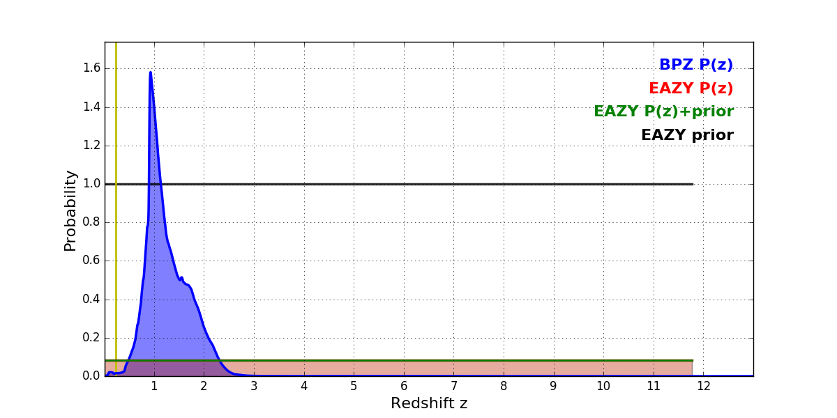 In P(z) plots: Yellow lines mark the cluster redshift z = 0.228,