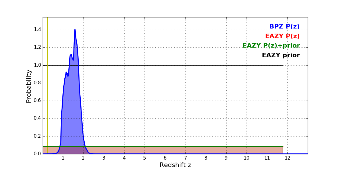 In P(z) plots: Yellow lines mark the cluster redshift z = 0.228,