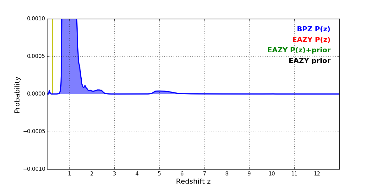 In P(z) plots: Yellow lines mark the cluster redshift z = 0.228,