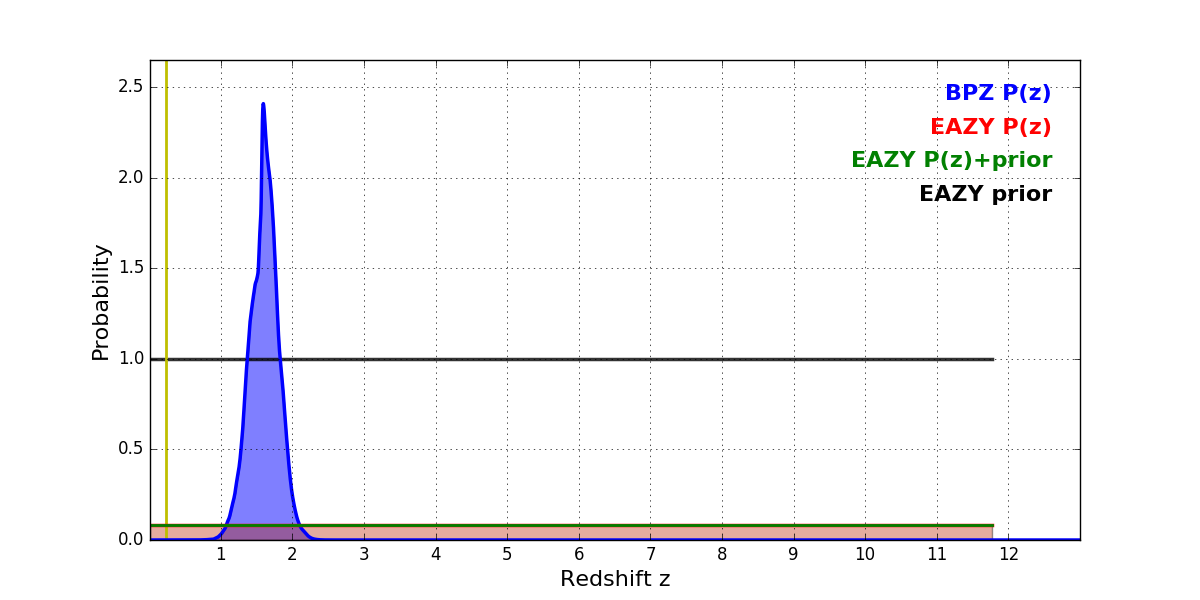 In P(z) plots: Yellow lines mark the cluster redshift z = 0.228,