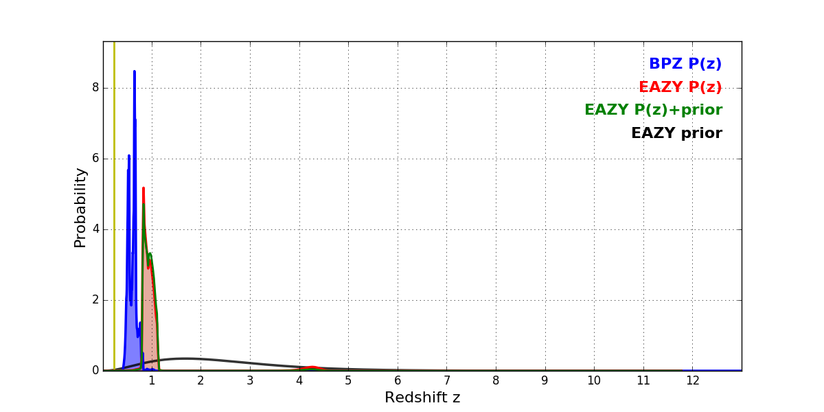 In P(z) plots: Yellow lines mark the cluster redshift z = 0.228,