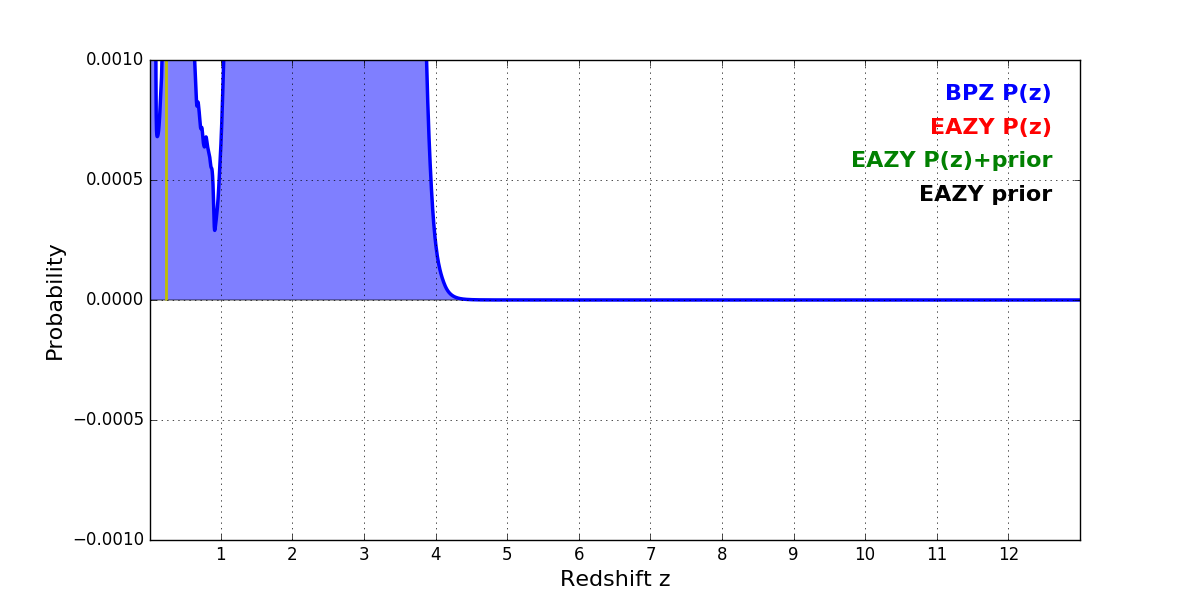 In P(z) plots: Yellow lines mark the cluster redshift z = 0.228,