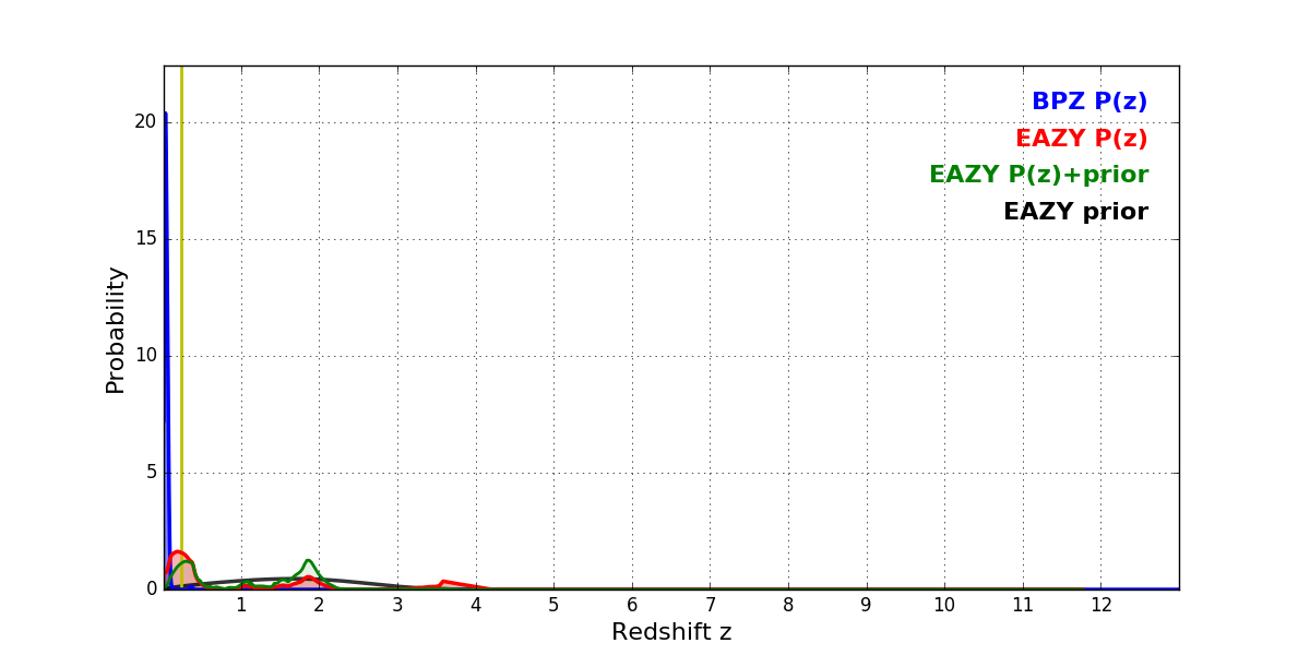 In P(z) plots: Yellow lines mark the cluster redshift z = 0.228,