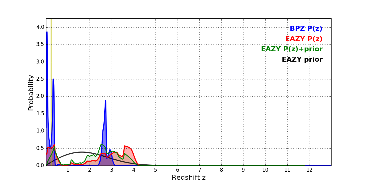 In P(z) plots: Yellow lines mark the cluster redshift z = 0.228,