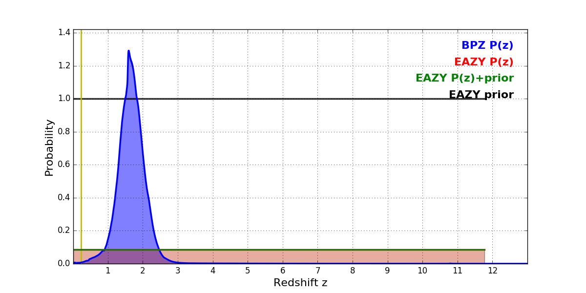 In P(z) plots: Yellow lines mark the cluster redshift z = 0.228,
