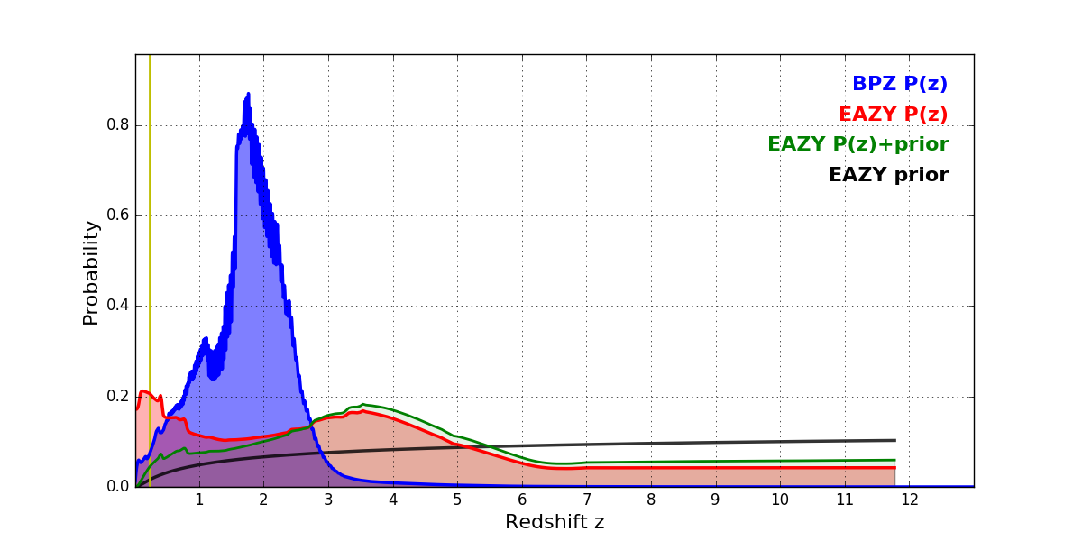 In P(z) plots: Yellow lines mark the cluster redshift z = 0.228,