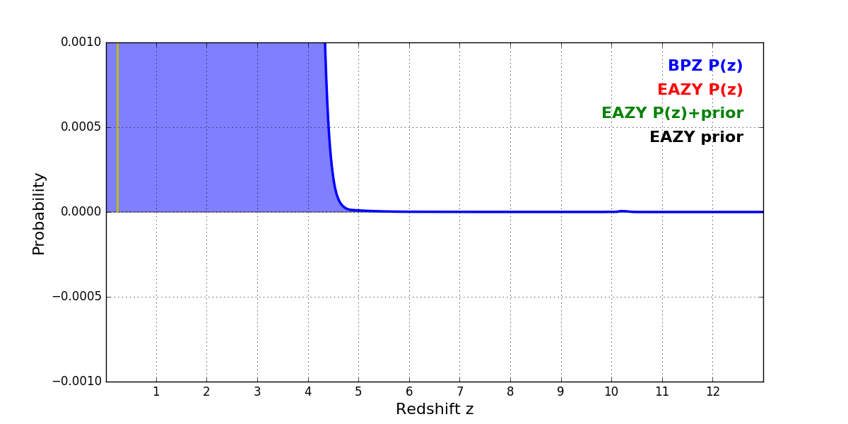 In P(z) plots: Yellow lines mark the cluster redshift z = 0.228,
