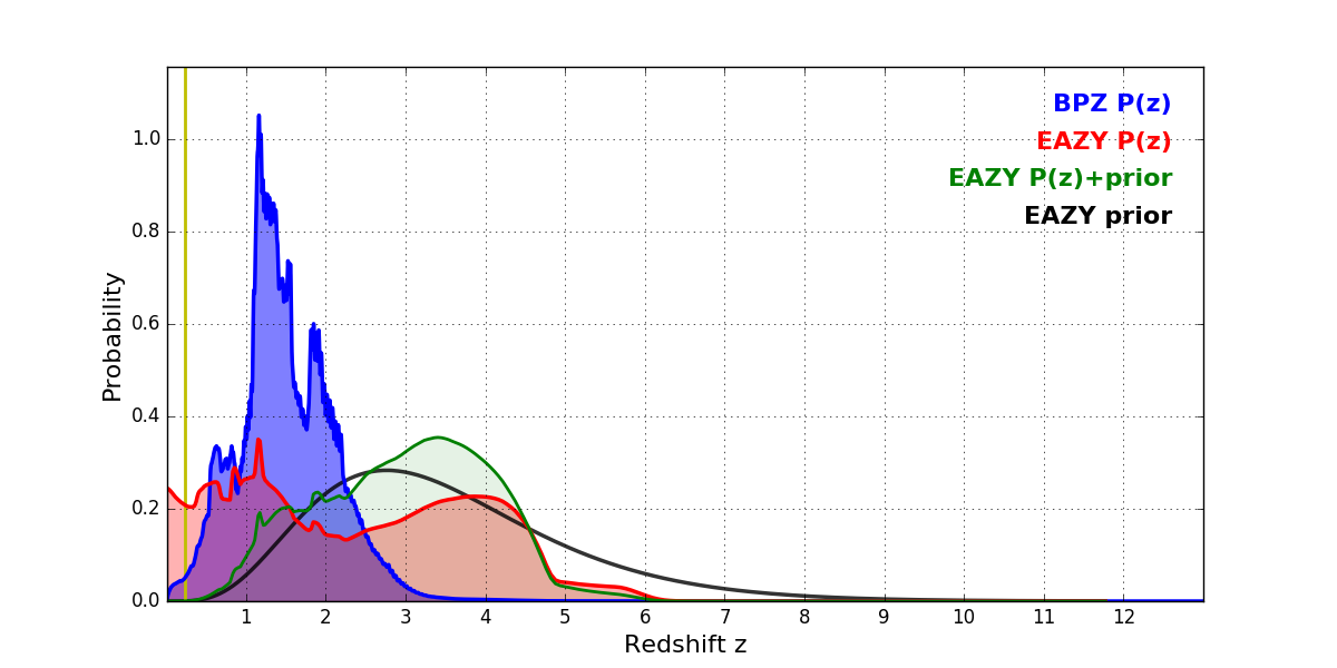 In P(z) plots: Yellow lines mark the cluster redshift z = 0.228,