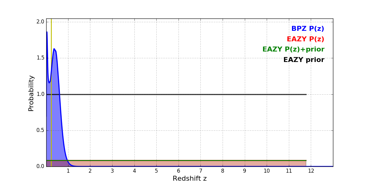 In P(z) plots: Yellow lines mark the cluster redshift z = 0.228,