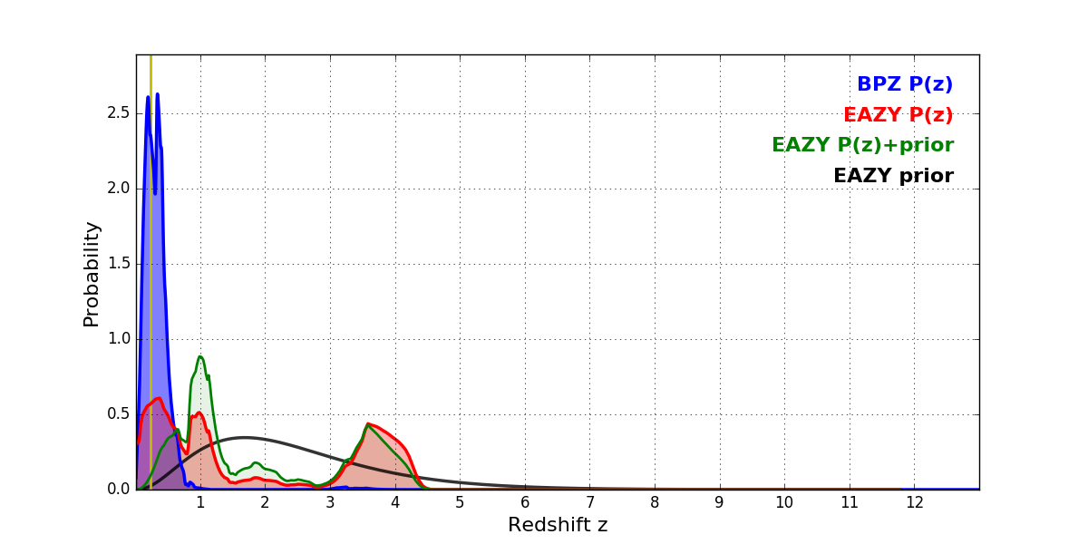 In P(z) plots: Yellow lines mark the cluster redshift z = 0.228,