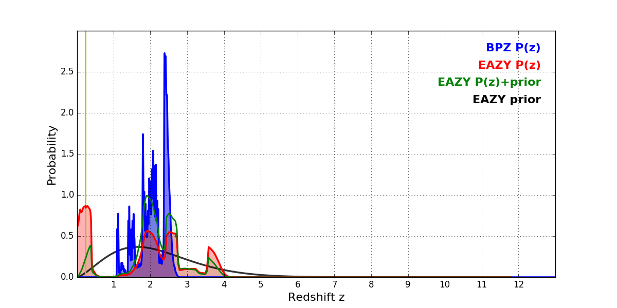 In P(z) plots: Yellow lines mark the cluster redshift z = 0.228,