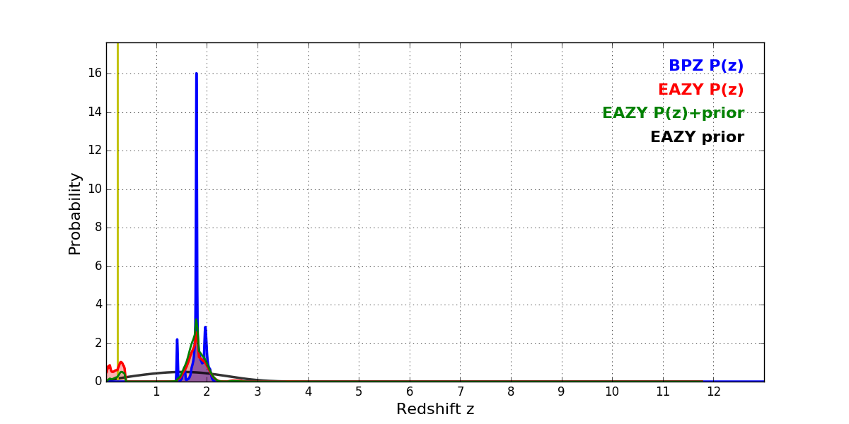 In P(z) plots: Yellow lines mark the cluster redshift z = 0.228,