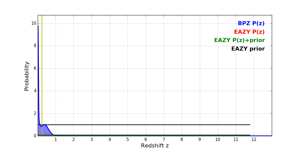 In P(z) plots: Yellow lines mark the cluster redshift z = 0.228,