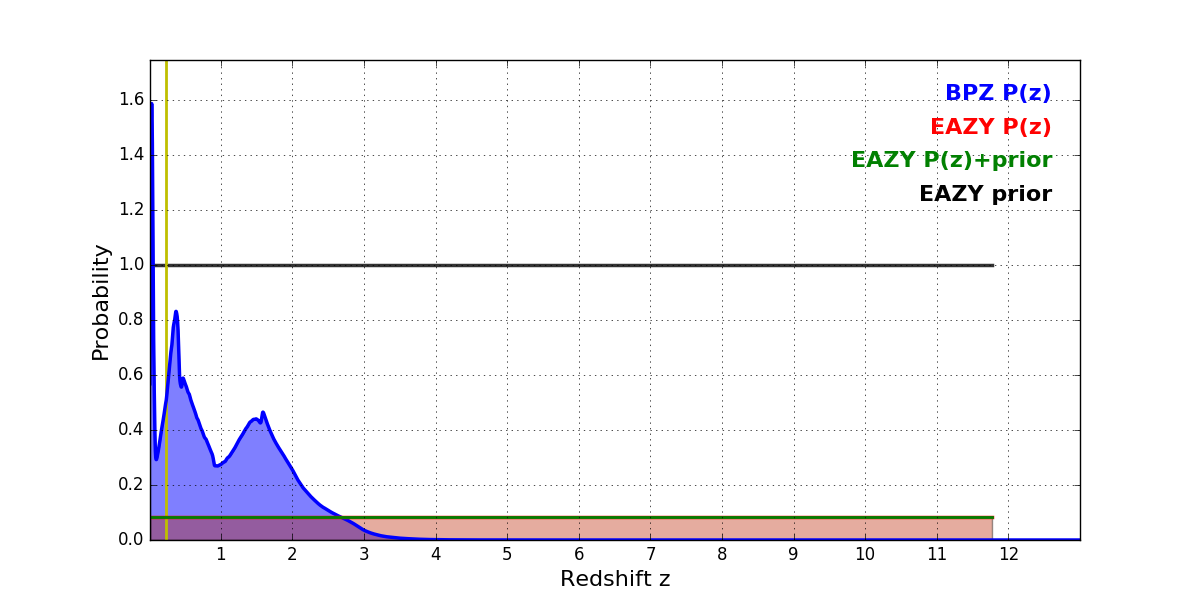 In P(z) plots: Yellow lines mark the cluster redshift z = 0.228,