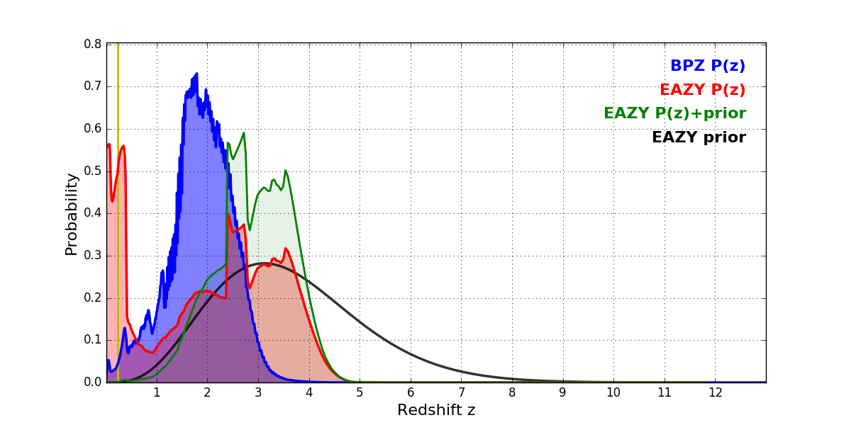 In P(z) plots: Yellow lines mark the cluster redshift z = 0.228,