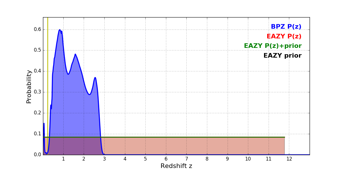 In P(z) plots: Yellow lines mark the cluster redshift z = 0.228,