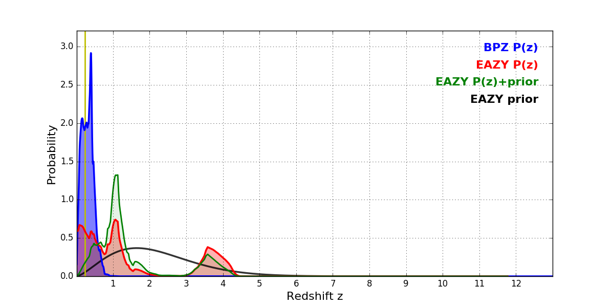 In P(z) plots: Yellow lines mark the cluster redshift z = 0.228,