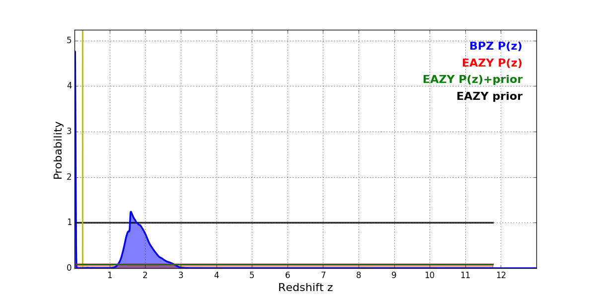 In P(z) plots: Yellow lines mark the cluster redshift z = 0.228,