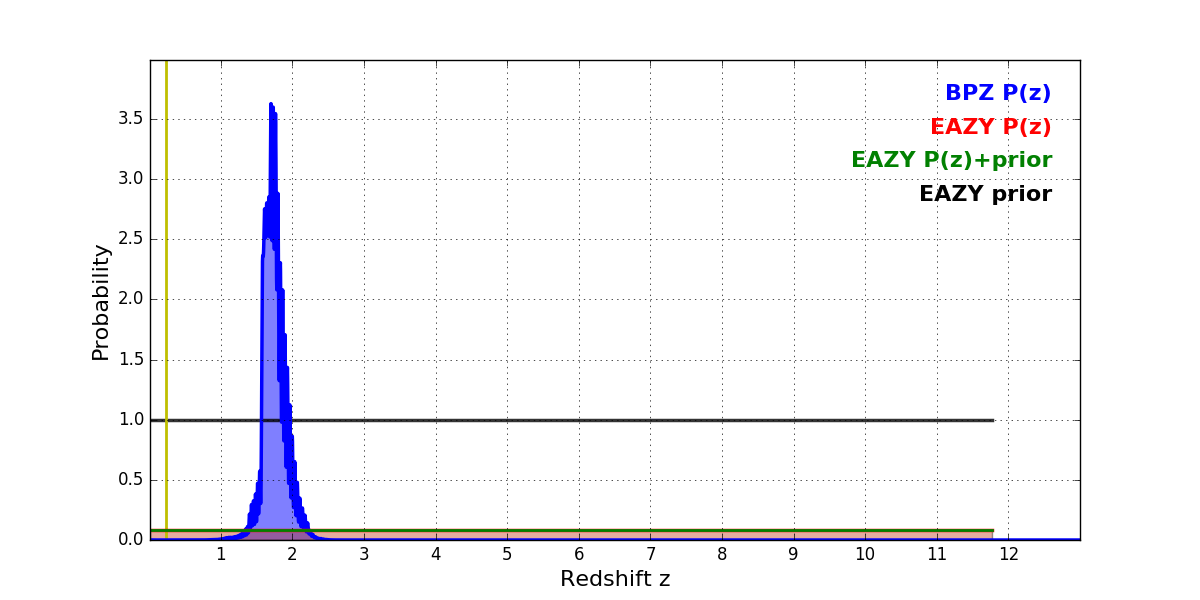 In P(z) plots: Yellow lines mark the cluster redshift z = 0.228,