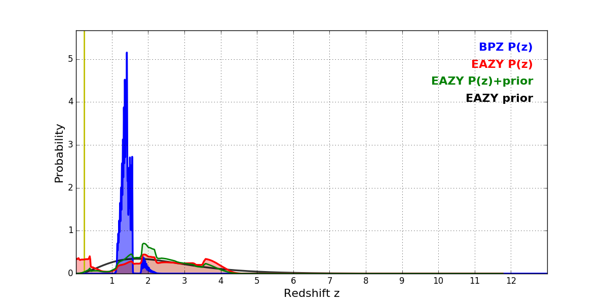 In P(z) plots: Yellow lines mark the cluster redshift z = 0.228,