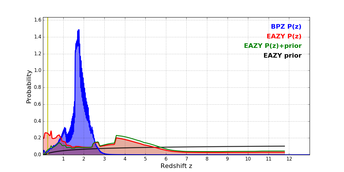 In P(z) plots: Yellow lines mark the cluster redshift z = 0.228,