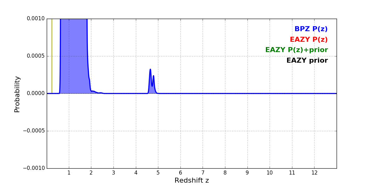 In P(z) plots: Yellow lines mark the cluster redshift z = 0.228,