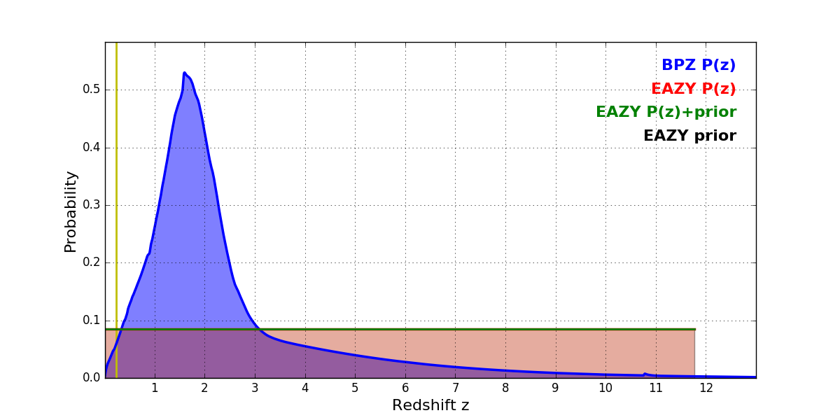 In P(z) plots: Yellow lines mark the cluster redshift z = 0.228,
